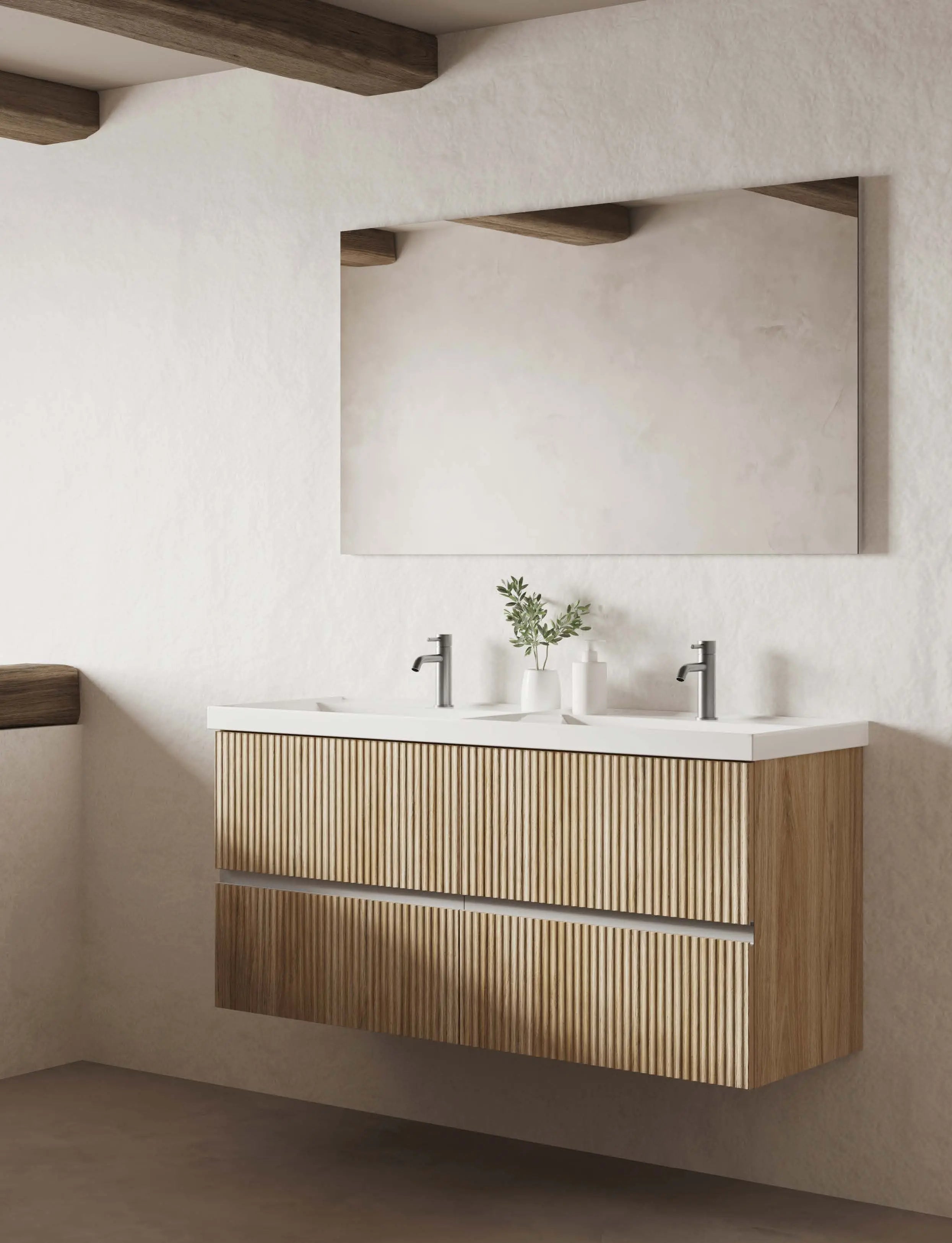 This modern bathroom vanity features a stunning fluted texture, bringing a tactile, sophisticated edge to contemporary interiors. Designed for versatility, this wall-mounted bathroom cabinet is available in four exquisite finishes: Matte White, Natural Hickory, Walnut Nocce, and Matte Mineral Green, ensuring a perfect match for any aesthetic.